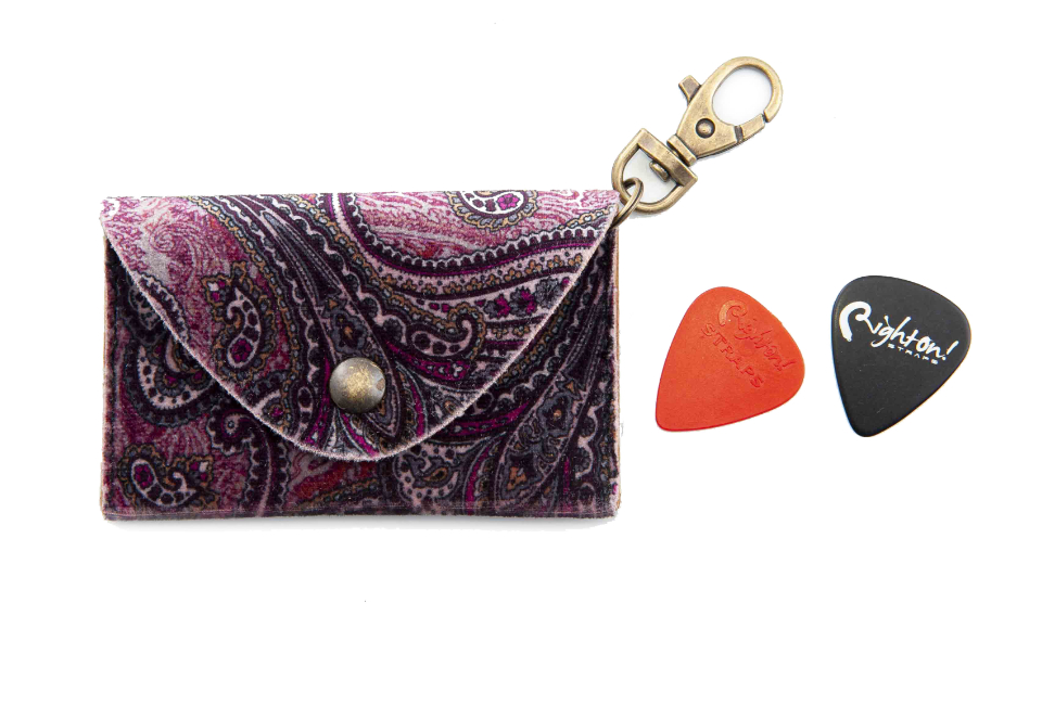 Custodia in similpelle per plettri con gancio portachiavi. Colore rosso borgogna.