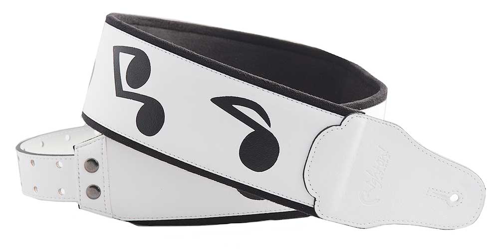 Tracolla in pelle di alta qualità, imbottitura in lattice rivestito con microfibra, estremità in cuoio, sistema di regolazione RAS e porta plettri incorporato. Colore bianco, con dettaglio chiave di note musicali, larghezza 8 cm, lunghezza regolabile da 98 cm a 153 cm. Indicata per chitarra e basso.