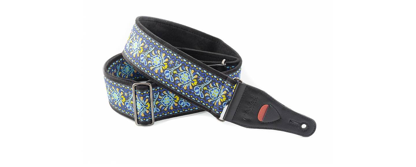 Tracolla in tessuto decorata con un motivo astratto vintage, rivestita con microfibra, estremita in cuoio di alta qualita. Colore blu, larghezza 5 cm, lunghezza regolabile da 86 cm a 150 cm. Indicata per chitarra e basso.