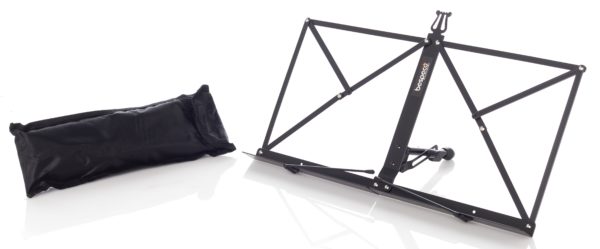 Leggio in metallo da tavolo con piedini antiscivolo in gomma. Totalmente richiudibile. Borsa in nylon inclusa.