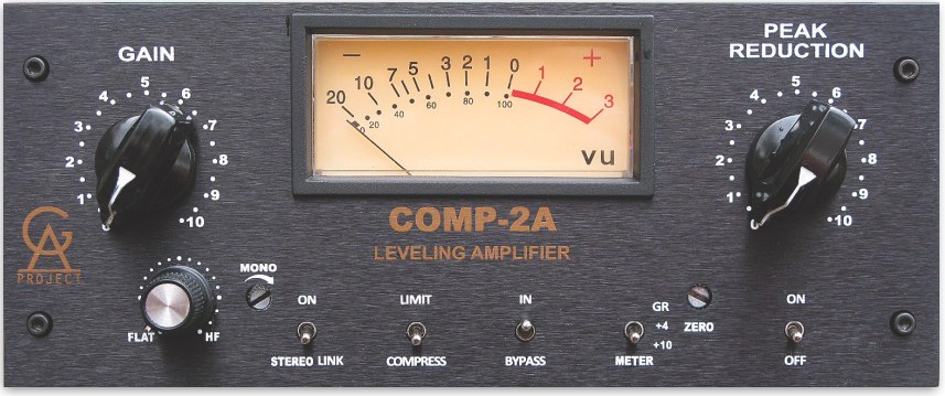 Compressore vintage a un canale, basato sui classici circuiti utilizzati negli anni 60. Realizzato con componenti discreti e valvole nello stadio di ingresso e nel circuito side chain, trasformatori bilanciati in ingresso e uscita, controllo HF per esaltare le medio/alte frequenze, utilizza il classico attenuatore elettro-ottico T4 per il controllo del gain. È quipaggiato con interruttori On/Off, e due manopole per gain e peak reduction, true bypass, compressor/Limiter, link (per l’utilizzo di 2 Comp-2A in stereo), meter comp/output e indicatore di livello analogico.