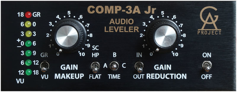 Compressore vintage a un canale, basato sui classici circuiti utilizzati nel famoso LA-3A. Realizzato con componenti discreti e trasformatore bilanciato in input/output con possibilità di selezione della resistenza in uscita, controllo HF per esaltare le medio/alte frequenze, utilizza il classico attenuatore elettro-ottico T4 per il controllo del gain. È quipaggiato con due manopole per gain e peak reduction, interruttori On/Off, true bypass, meter comp/output, 3 differenti tempi di controllo, indicatore di livello analogico, infgresso link (per l’utilizzo di 2 Comp-3A JR in stereo).