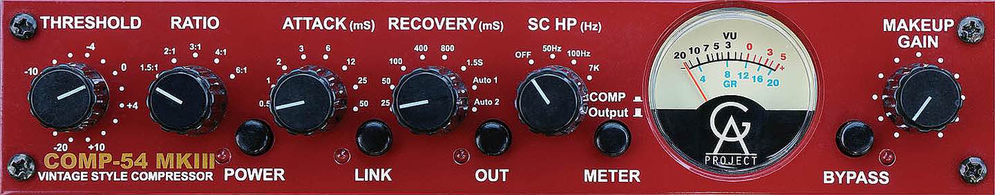 Compressore vintage a un canale, basato sui classici circuiti utilizzati da Neve, EMI ed altri costruttori, realizzato con componenti discreti e trasformatori, equipaggiato con interruttori On/Off, true bypass, compressione In/Out, interruttore link (per l’utilizzo di 2 Comp-54 in stereo), meter comp/output, e terminazione a 600 Ohm per l’utilizzo in serie di apparecchi moderni, regolazione threshold, ratio, attack, release, HPF e gain, indicatore di livello analogico, ingresso XLR/jack da 1/4” bilanciato, uscita XLR/jack da 1/4” bilanciato, connettore link in formato jack da 1/4”, connettore insert in formato jack da 1/4” per il collegamento diretto ad EQ-73 e EQ-81.