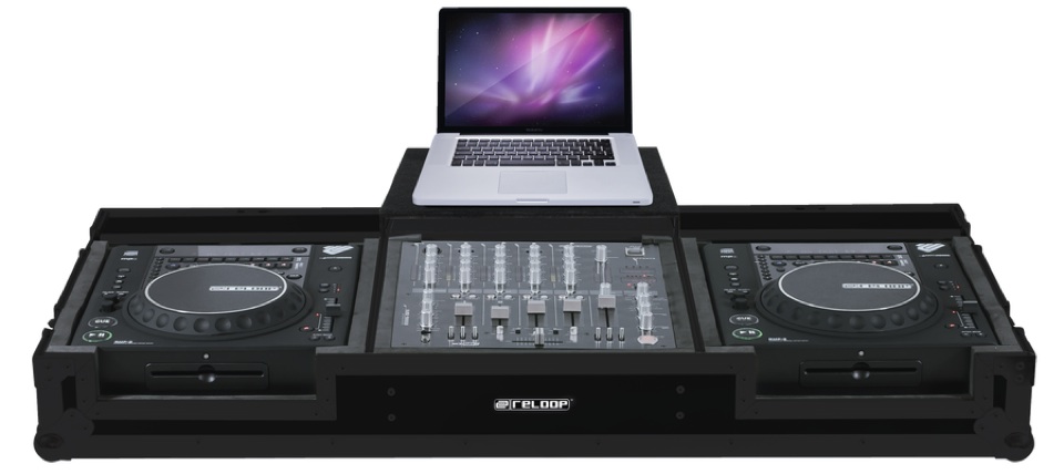 Robusto flight-case professionale in legno rivestito, per il trasporto di due CD Player Reloop serie RMX (o Pioneer CDJ-1000, o altri similari) e un mixer Reloop RMX-40 (o Pioneer DJM-800, o altri similari), dotato di mensola per il posizionamento di un computer portatile, maniglie a scomparsa, angoli rinforzati, imbottitura interna, chiusure di sicurezza, dimensioni 1138x 230 x 490 mm, peso 18,1 kg.