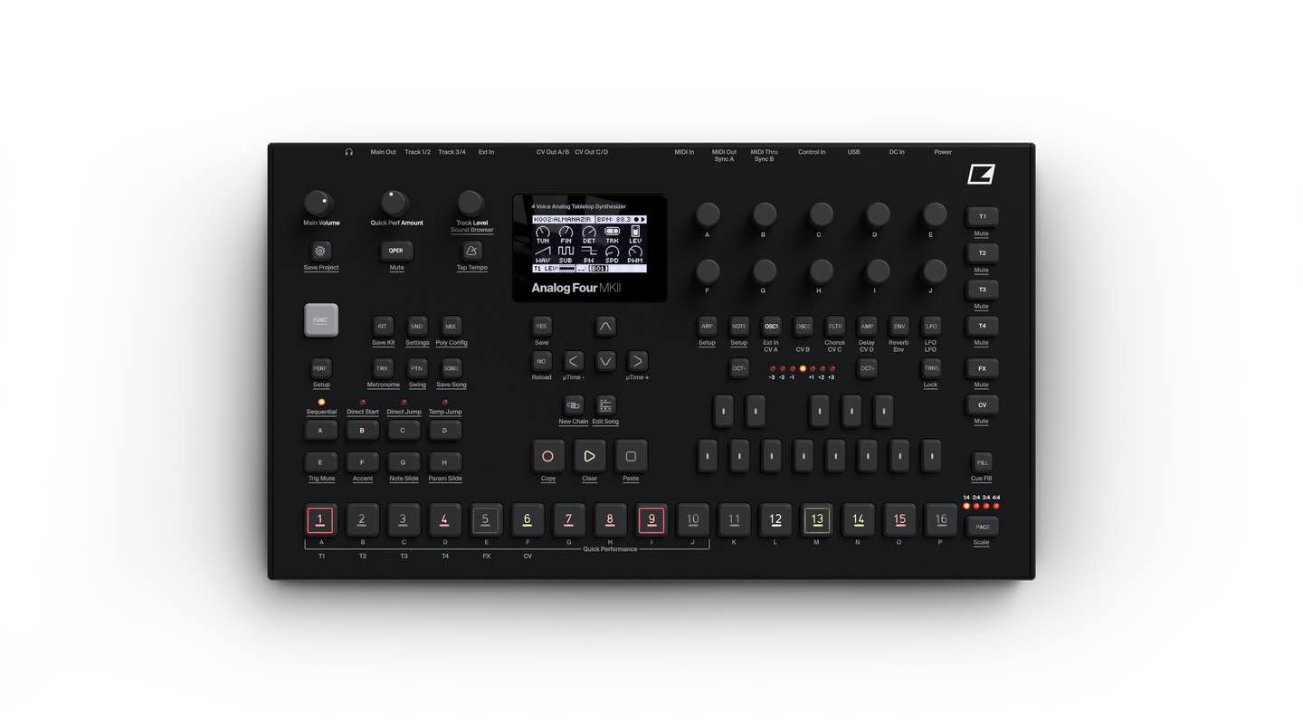 Sintetizzatore analogico a 4 voci, dotato di 2 oscillatori analogici, 2 filtri analogici, 1 circuito overdrive, inviluppi e LFO per ogni voce, avanzato sequencer a 6 tracce (4 tracce synth, 1 traccia effetti, 1 traccia CV/Gate), pattern con fino a 64 step (lunghezza indipendente per ciascuna traccia), 6 arpeggiatori, effetti Wideshift Chorus, Saturator Delay e Supervoid Reverb, controllo in tempo reale su tutti i parametri, caricamento istantaneo di suoni e kit, pieno supporto MIDI, 2 ingressi jack da 1/4″ sbilanciati, 2 uscite Main con jack da 1/4″ bilanciate, 4 uscite stereo separate con jack da 1/4″ sbilanciate, 1 uscita cuffie, 2 ingressi Expression/CV, 4 uscite CV/Gate per il controllo dei classici dispositivi analogici, MIDI In/Out/Thru, presa DIN Sync Out, convertitori A/D e D/A a 24-bit/48 kHz, OS aggiornabile su Flash-EEPROM, memoria interna +DRIVE, porta USB 2.0, display OLED a 128×64 pixel. Dimensioni: 385 x 225 x 83 mm. Peso: 2.4 kg.
