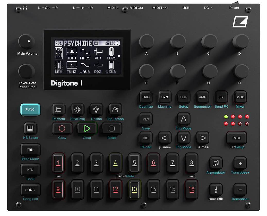 Sintetizzatore digitale a 16 voci (multitimbriche) con 4 × synth macchine (Wavetone, Swarmer, FM Tone, FM Drum), 6 x filter macchine (Multi-Mode, Lowpass 4, Equalizer, Comb+, Comb-, Legacy LP/HP), sequencer con 16 tracce synth o MIDI, Base-Filter, 3 × LFO, bit and sample rate reduction per voce asseganbili, 128 step per pattern e traccia, 1 arpeggiatore e modifica note per traccia, sequenze polifoniche, lunghezze individuali delle tracce, blocco dei parametri, trig condition, micro timing, cambio suono per step, generatore Euclideo, effetti send di chorus, delay e reverb, master overdrive, supporto Overbridge, 2 ingressi audio con jack da 1/4” sbilanciato, 2 uscite audio con jack da 1/4” bilanciato, uscita cuffie, porta USB 2.0, MIDI In/Out/Thru. Dimensioni: 215 × 176 × 63 mm. Peso: 1.48 kg.